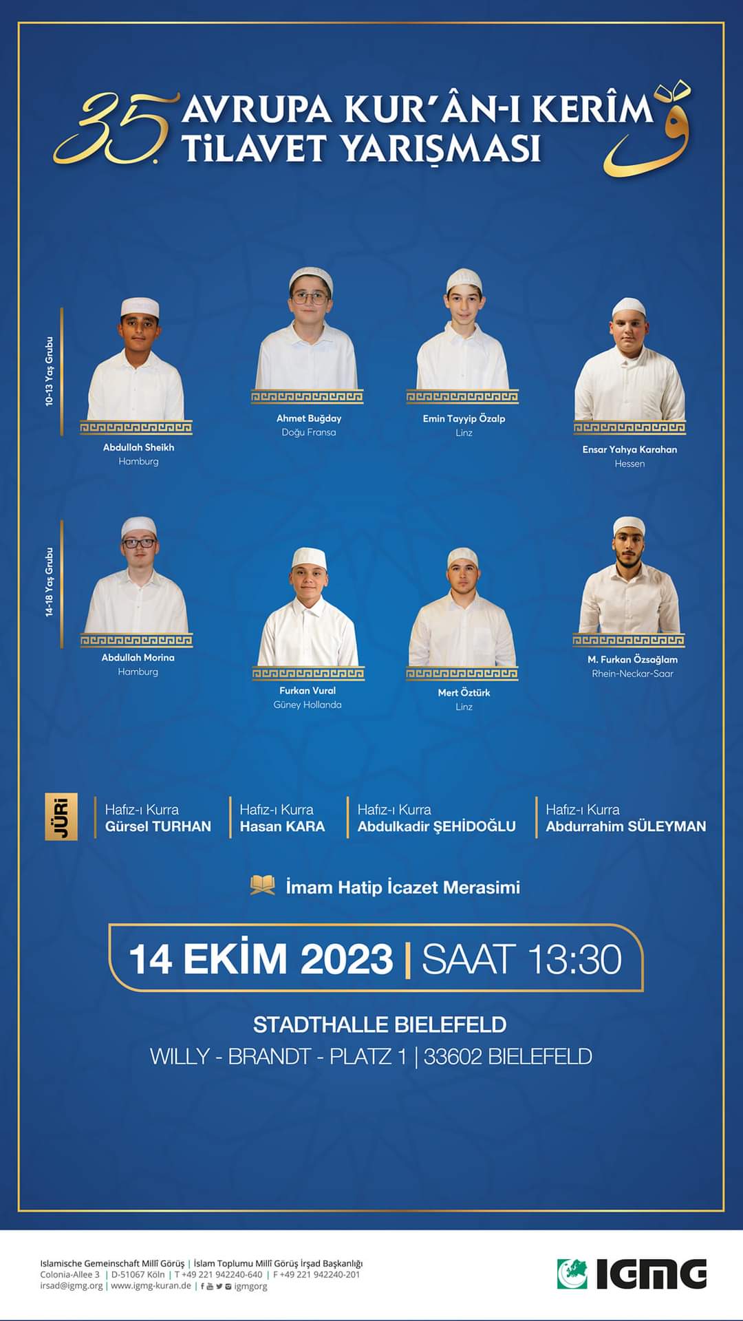 14 Ekim'de gerçekleşecek 35. Avrupa Kur'an-ı Kerim Tilavet Yarışmasına tüm halkımız davetlidir.