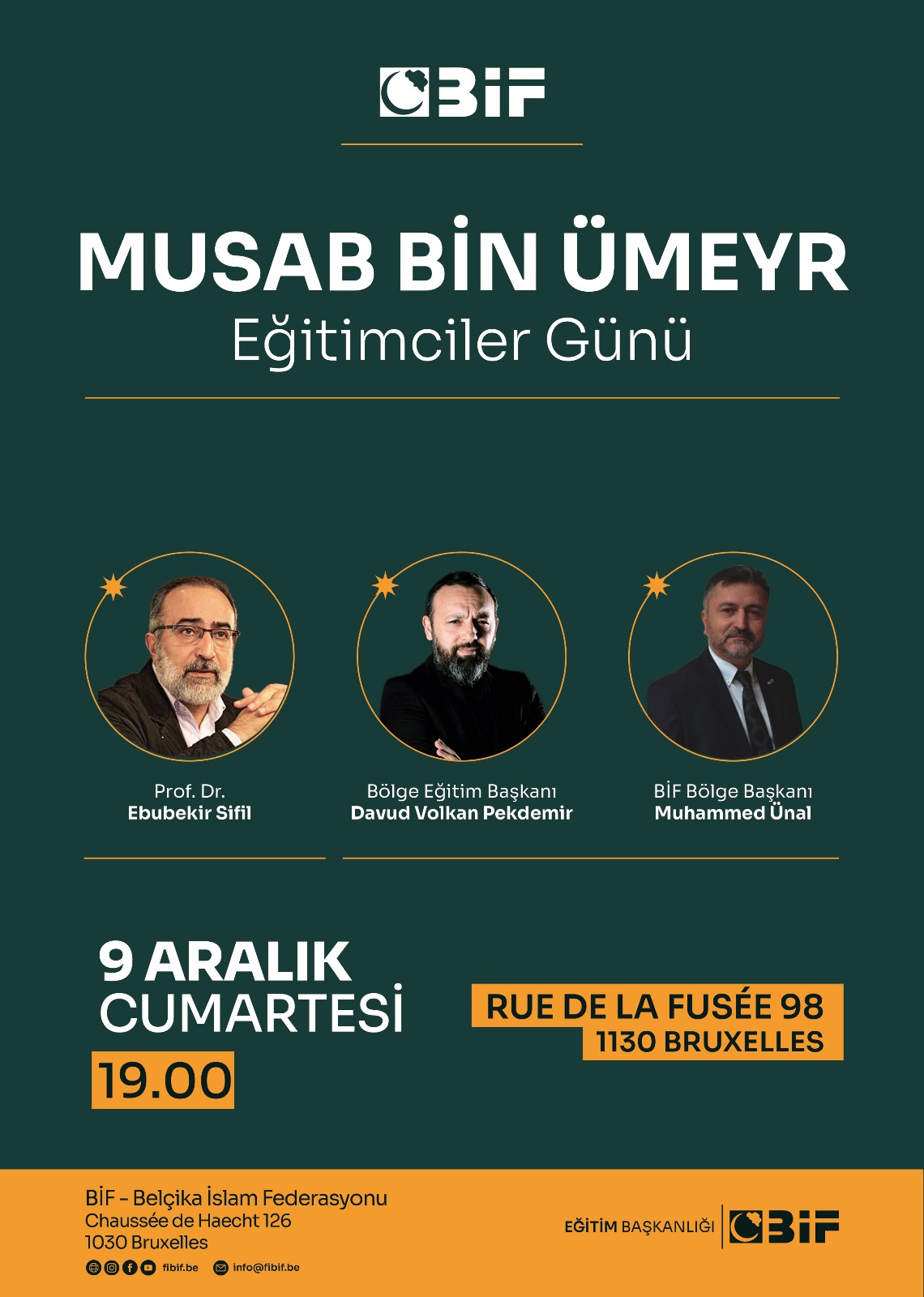 Katılımcılar arasında BİF Bölge Başkanı Muhammed Ünal, Bölge Eğitim Başkanı Davud Volkan Pekdemir ve Prof. Dr. Ebubekir Sifil'in de yer aldığı 'Musab Bin Ümeyr Eğitimciler Günü' isimli programımıza tüm halkımız davetlidir.